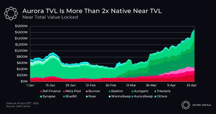 - Aurora is the EVM implemented as a smart contract on Near and has nearly 3x the TVL on native Near.