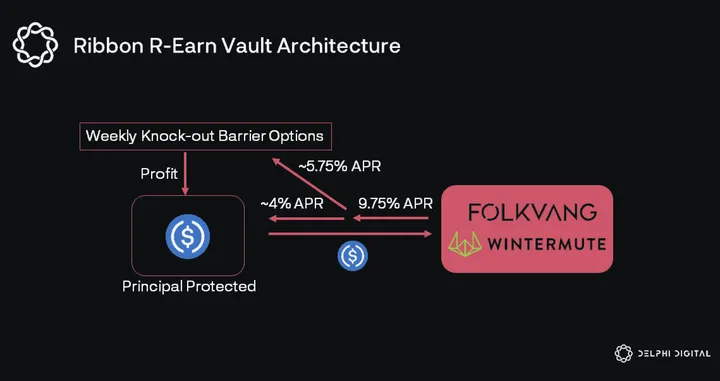 - Ribbon’s R-Earn vault takes an approach that is similar to Maple Finance. Vault funds are lent to market makers (Wintermute and Folkvang Trading) at 9.75% APR over 28-day epochs.