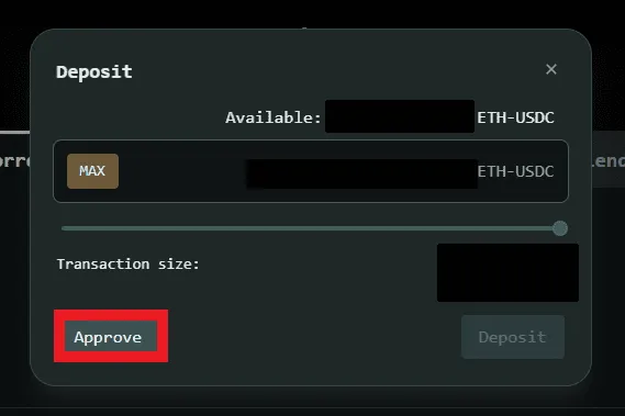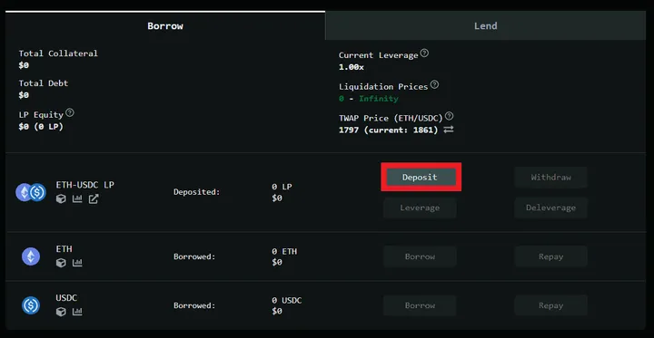 2. Here you’ll find all the important Vault details such as Total $ Supplied, Borrowed, Utilization Ratio, APR and more. Select “Deposit” under the Borrow tab.