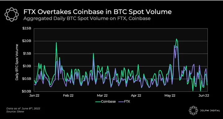 - Since the middle of May, FTX’s aggregated daily volume for Bitcoin spot trades has exceeded that of Coinbase.