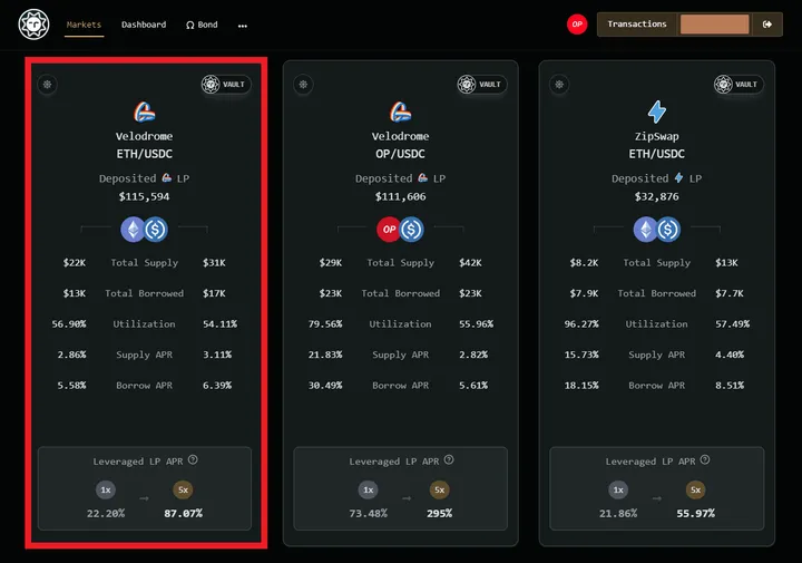 1. Go to Tarot’s Markets tab. Select the “Velodrome ETH/USDC” Vault.