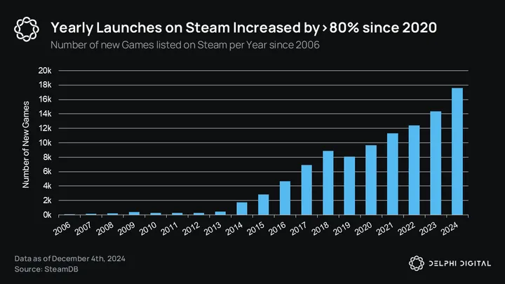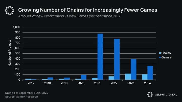 The number of new gaming-focused ecosystems, particularly Layer 2s and Layer 3s, has skyrocketed, creating a growing imbalance between the number of networks vs. games. With over 104 new L2/L3 networks announced in 2024 for just 263 new games, the ratio speaks to the perceived “premium” of ecosystems vs individual apps.