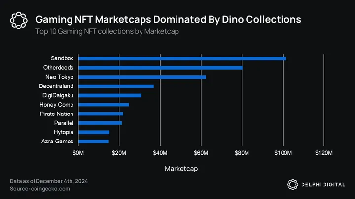 As previously mentioned, Web3 gaming NFTs have shown small signs of recovery over the past 12 months, with trading volumes increasing significantly since November 2024. The volume for collections like Pirate Nation Genesis Pirates and Hytopia Worlds has seen over 100% month-over-month growth, while My Pet Hooligan and Infinigods have experienced a 50% increase since October 2024. Astonishingly, old gaming NFT collections like Sandbox, Decentraland, and Otherdeed/Otherdeed Expanded – three metaverse projects that have lost most of the hype surrounding them throughout 2022 – are still leading the charge with Neo Tokyo as the most valuable gaming NFT collections by marketcap.