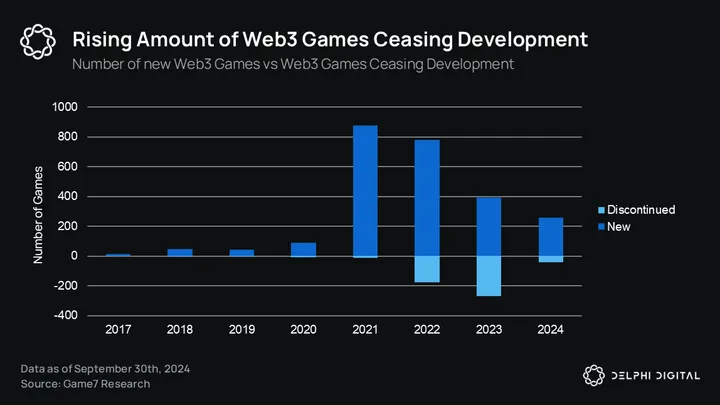 The bear market of 2022 and 2023 acted as a much-needed purge, with many subpar projects ceasing development. Of the 2,489 funded Web3 gaming projects tracked by Game7 DAO, 514 have stopped development, with over half (271) in 2023 alone.