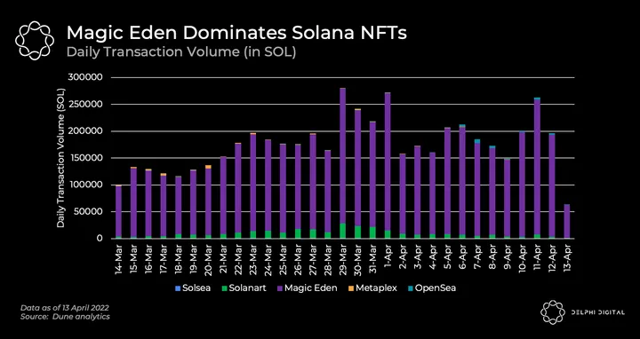 - OpenSea finally launched its beta Solana marketplace on Apr 7 with an interface that is very familiar to most NFT traders. During the beta launch, OS stated that there will be limited collection coverage. The full launch will include a scalable way to expand coverage via the Metaplex collection standard. So far, Solana transaction volumes on OS have been relatively tiny with Magic Eden continuing to dominate on Solana. Will that change in the future once OS fully launches? We shall see.