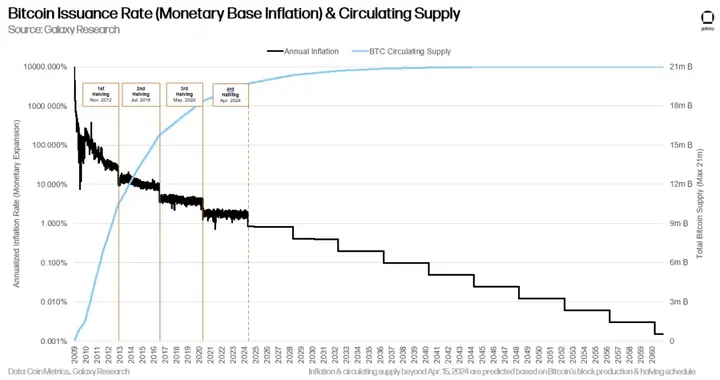 As Satoshi’s 15-year-old code instructs, the block reward will decline from 6.25 to 3.125 BTC — equivalent to a daily reduction of ~450 BTC. This will drive Bitcoin’s annualized inflation rate down from roughly 1.7% to 0.85%.