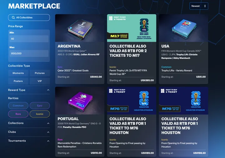 The marketplace features tradeable collectibles ranging from common to iconic rarities. Fans can buy cards tied to players, jersey kits, iconic soccer highlights, and even collectibles that grant the right to buy access for World Cup 2026 seats. These NFTs can be put to work in challenges that reward themed set completions (like 11 player cards from the same team) with leaderboard points, card packs, and IRL game tickets.