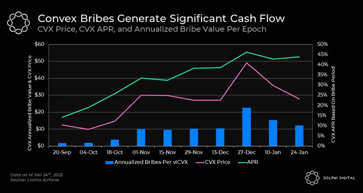 Annualized bribes per vlCVX have grown from $1.76 in the first epoch to over $22.72 at their peak in Dec., representing a 46% APR on vlCVX; over $76M has been collected in bribes since inception.