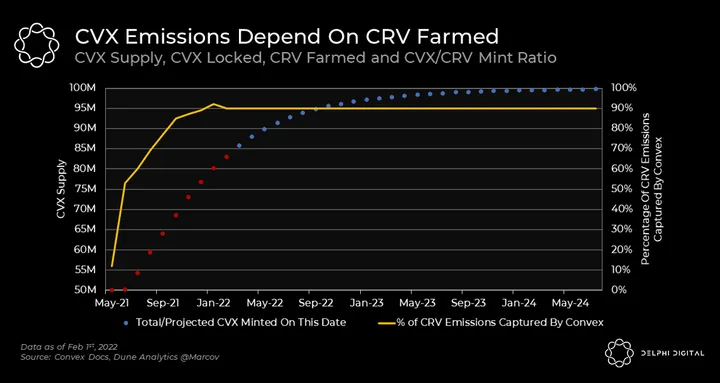 During Jan., an average of 92% of CRV had been farmed via Convex. If we project out a 90% Convex farm rate into the future, CVX emissions will be largely depleted within 12 months (47.5M/50M set for LPs).