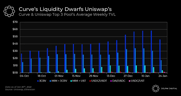 From a wider view, these assets will ultimately be priced based on the success of Curve as a DEX, so let’s take a look at the macro picture for Curve and how it stacks up against its competition.