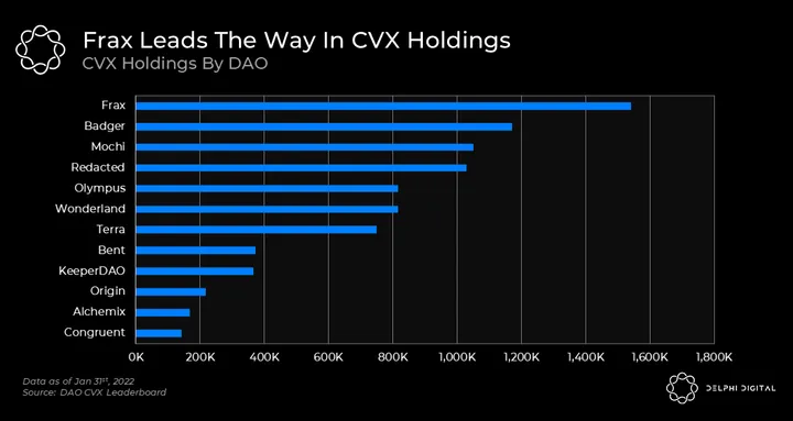 Many DAOs have been in a heated race to accumulate CVX to either support their own stablecoin / pegged asset with CRV emissions (Frax/Badger/Terra/Alchemix), or to deploy their treasury into a yield-bearing asset (Redacted Cartel/Olympus).