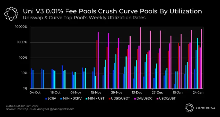 Uniswap V2 utilized a constant product formula of x * y = k to determine the price of an asset. In order to ensure liquidity across all potential prices, Uniswap spreads an LP’s assets across the entire price curve from 0 to infinite. With V3 came the concept of concentrated liquidity – a more efficient way to provide liquidity and generate returns within a fixed price band. In the case of stablecoins, v3 allows LPs to provide liquidity in a very tight range, let’s say from $.99 cents to $1.01, allowing for significantly enhanced capital efficiency over V2. The introduction of Uniswap V3 alongside 0.01% fees allowed for the creation of hyper efficient pools for stablecoins that operate at extremely high utilization rates.