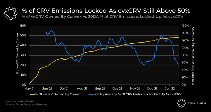 Well, for that we must pay attention to the percentage of CRV emissions that are being locked in cvxCRV. Not all CRV emissions will be locked as veCRV, so it’s safe to say that as long as this ratio stays equal to or above the percentage of veCRV that Convex owns, then Convex’s share of governance and thus its influence over future emissions will not be diluted over time. (Note this doesn’t account for existing circulating CRV being locked up as veCRV).