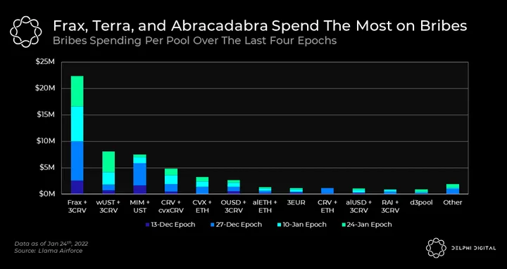 Bribes are currently dominated by stablecoin protocols – mainly Frax, Terra and Abracadabra, with smaller participants such as Lido, Reflexer, Alchemix, Tribe and Angle also participating. That said, the bribe market is very concentrated, with the top 3 protocols contributing 2/3rds of total bribes. This makes sense as liquidity is the name of the game for stablecoins and Curve is the deepest, most liquid place to trade them on-chain.