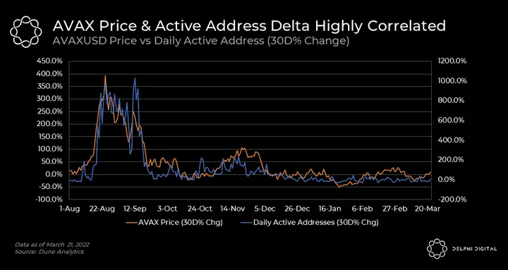 - We also see a high degree of correlation between the growth rate in AVAX price versus daily active addresses. The chart below highlights this by comparing the 30-day percentage changes in AVAX price and daily active addresses.