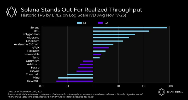 We highlight some of these examples as we go through the different designs. But before we start, it’s important to define what we mean by scalability. Put simply, scalability is the ability to process more transactions without increasing the cost to validate them. With that in mind, let’s take a look at current TPS figures for various chains. Throughout this post, we’ll explain the design properties that enable these varying levels of throughput. Importantly, the numbers shown below are not the max levels that can be achieved, but rather the actual historical levels which are dependent on usage.