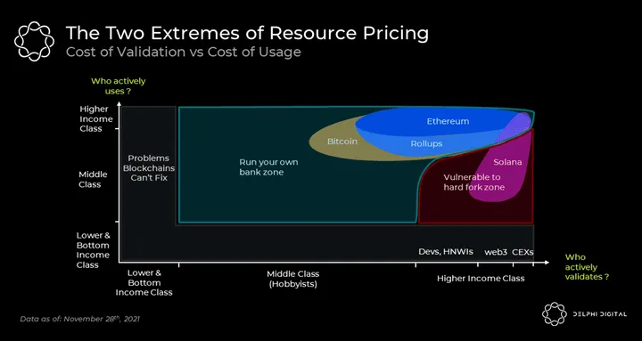 Even though Solana’s throughput gains are beyond what can be achieved by simple parameter tweaks, it’s still in large part owed to more intensive hardware and network bandwidth usage. While this lowers fees for users, it restricts node operations to data centers. This comes in contrast to Ethereum which, although inaccessible to many due to exorbitant fees, is ultimately governed by its active users who can run nodes from home.