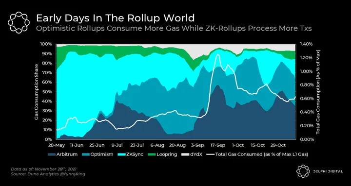 ZK-Rollups can offer more scalability than Optimistic Rollups, which is already being seen in practice. dYdX, for example, has been processing roughly 10x more throughput than Optimism while consuming 1/5th of it’s L1 footprint.