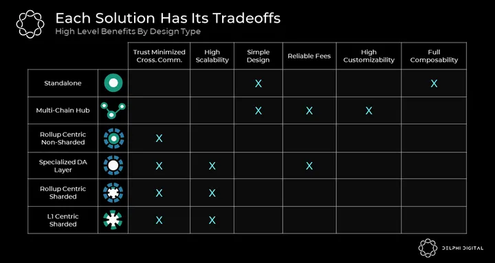 We have evaluated different blockchain designs including monolithic chains, multi-chain hubs, rollups, sharded chains, and specialized DA layers. Given their relatively simple infrastructure, wider design space and ability to expand horizontally we think multi-chain hubs are best suited to address the immediate needs of blockchain space. In the longer term, given their resource efficiency and unique scalability properties, specialized DA layers may very well be the end-game.