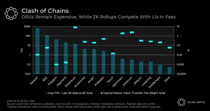 First, let’s zoom in on standalone chains. Under this camp, Polygon PoS and BSC don’t match our scalability definition as they increase throughput via bigger blocks — a well-known trade-off that increases the resource requirement of nodes and sacrifices decentralization for a performance improvement. While this trade-off has its market fit, it’s less compelling as a long-term solution. Polygon, however, recognizes this and is pivoting to a more sustainable solution centered around rollups.