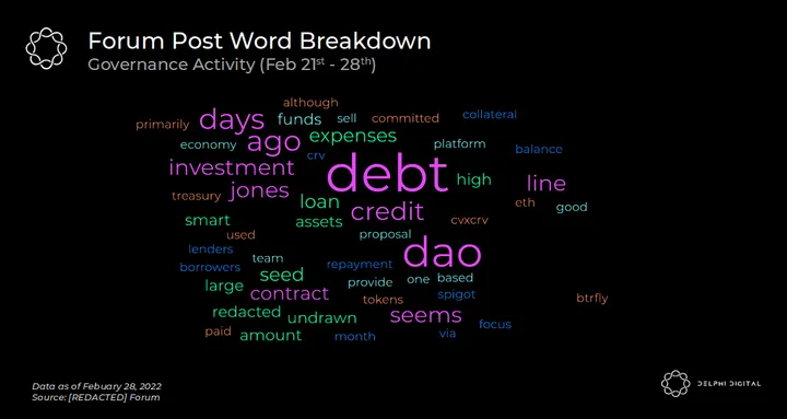 - Synopsis: Debt DAO, a new DAO currently focusing on providing uncollateralized loans to DAOs based on cashflows, has offered [REDACTED] a $5m credit line. [REDACTED]’s current non-governance token treasury mostly consists of ETH tied up in the ETH<>BTRFLY pool. Terms on the loan are as follows: