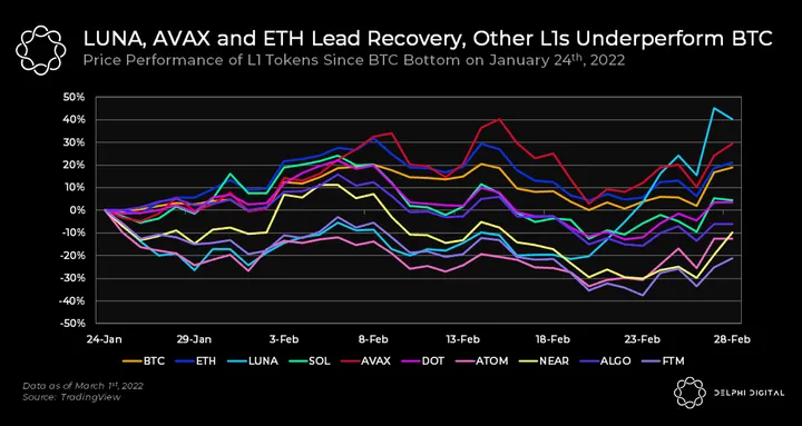 - Since the BTC bottom around Jan. 24th, most L1s have been underperforming BTC. With BTC recovering recently, most L1 tokens are still underwater even as BTC approaches +20% from its lows.