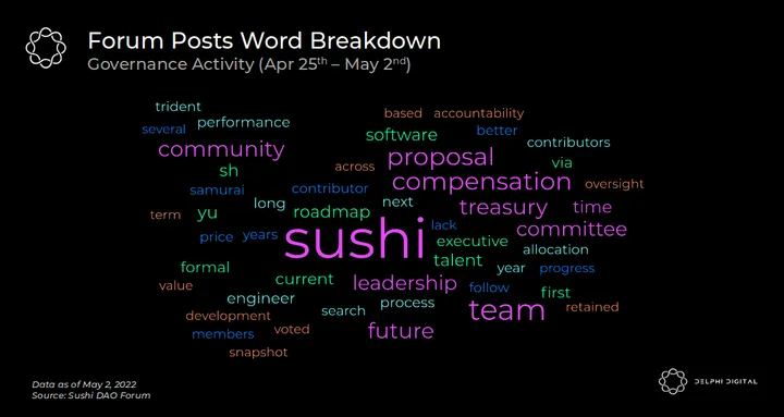 - Synopsis: Sushi received a restructuring proposal from JiroOno. The proposed restructuring has three components, each of which the community will need to approve through governance. The first component asks for 6m SUSHI, vesting over four years, for current and future contributor compensation. The second item proposes creating a compensation committee. The committee would be responsible for all aspects of compensation management. The committee will negotiate rates, track KPIs, establish responsibilities, and review performance. Thirdly, and probably most challenging, is a leadership search. With the dramatic loss of its previous leadership team and the crumbling of the Frog Nation proposal, Sushi has identified the need to find new leadership. The proposed search will be an extensive undertaking as the proposal allows any community member to nominate themselves.