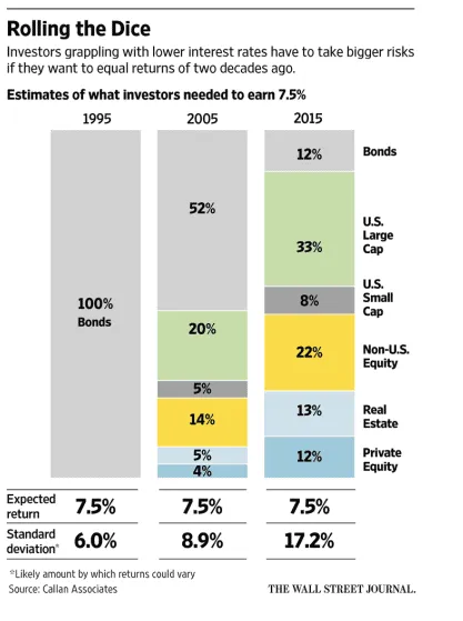 The end result is the same; investors must take on additional risk. This can be visualized in the graphic above which illustrates the change in portfolio allocations required to target a 7.5% return from 1995 to 2015. Note the standard deviation/variance changes over time, as well.