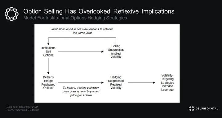 Some adverse event triggers a disruption in markets. The Fed institutes an accommodative monetary policy to kickstart the economy and stabilize markets. This drives down yields and pushes investors further out on the risk curve, in part because they have fixed dollar liabilities they need to match. This causes investors, especially institutional investors, to seek out alternative sources of yield. Selling calls is one alternative that’s grown in popularity, and with it the need for increased hedging by options dealers.