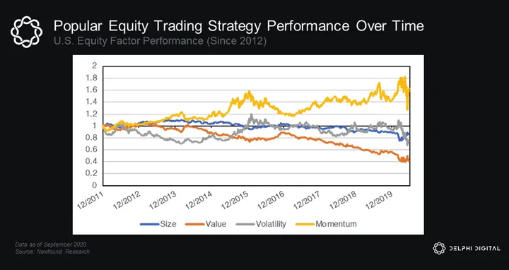 For example, if we think back to our traditional market analysis, we remember that momentum strategies have been the best performers over the last 10 years (the strongest bull run in history), and some of the only profitable ones at that. We have identified similar momentum-based pricing dynamics at play between crypto bull market cycles and traditional market cycles.