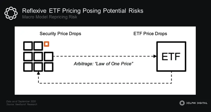 For example, if an asset in the S&P 500 loses value, the implication is that the index should also decrease in value. If the price function of securities in the S&P 500 are using the value of the index as a variable, a decrease in the value of the S&P 500 will lead to a decline in the value of other securities in the index. This again decreases the value of the S&P 500, leading to a negative reflexive feedback loop.