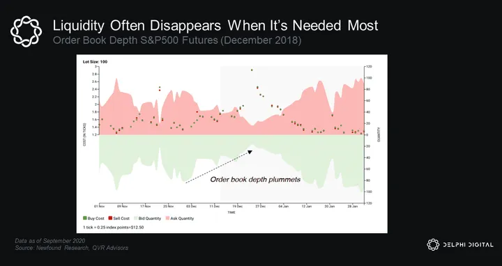 This leads us to a modern market phenomenon many have observed over the last 15 years – markets consistently experience a rapid deterioration in liquidity conditions during periods of market stress. Not only do we see order book depth evaporate, but bid/ask spreads also widen significantly, flying in the face of the supportive HFT argument made earlier.