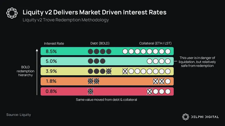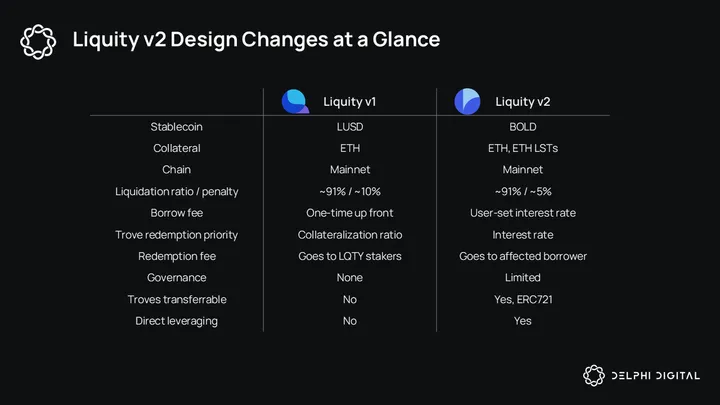 Liquity v2’s biggest design differences are its interest rate and redemption methodology. In Liquity v1, borrowers pay a one-time borrow fee up front, and troves with the lowest collateralization ratio are the first to be redeemed against. In v2, borrowers set the interest rate they are willing to pay. If BOLD falls below peg, the troves with the lowest borrow rate are redeemed against first.