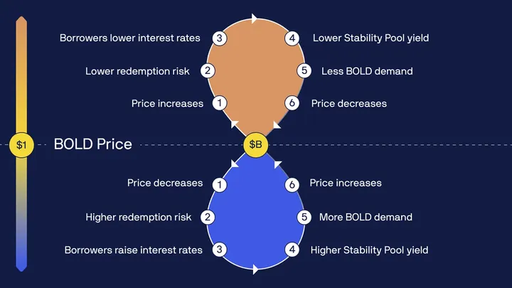 BOLD interest rates will react to price, further incentivizing course-correcting activity. When BOLD trades above $1, borrowing will carry lower perceived risk, putting downward pressure on rates and making leverage more attractive. When BOLD is below $1, increased redemption risk pushes borrow rates up, making borrowing less appealing and BOLD a more attractive purchase.