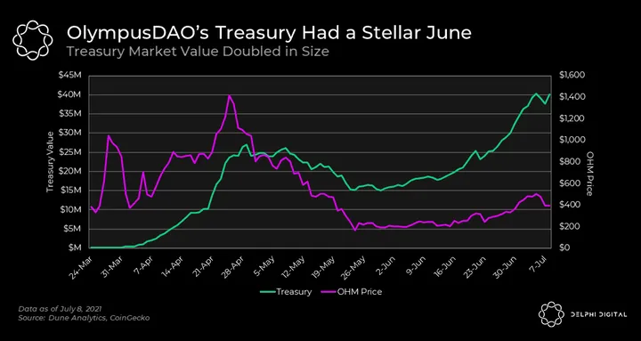 - OlympusDAO is a lesser-known DeFi protocol (with a thriving community) aiming to build a policy-controlled currency. The DAO’s treasury grew significant over June, and feeds off the concept of “protocol owned liquidity.”