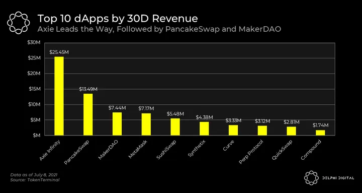 - Once again, Axie takes the cake as the top revenue-generating dApp, followed by PancakeSwap and MakerDAO.