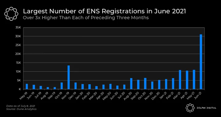 - As the price of ETH fell over June, people took the opportunity to snag cheap ENS domains, sending monthly registrations over 2x past their previous all-time high in Nov. 2019. Maybe June wasn’t so bad after all.