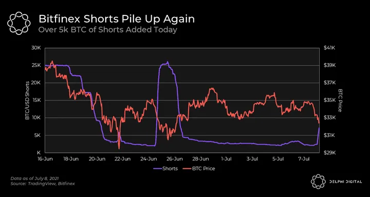 BTC is down 3.5% today as it makes way towards the range low. After a fun few days, alt season may have been short-lived; AXS has been hit the worst, down 22% in the last 24 hours. In today’s edition, we cover the re-emergence of Bitfinex shorts and why June wasn’t such a bad month after all.