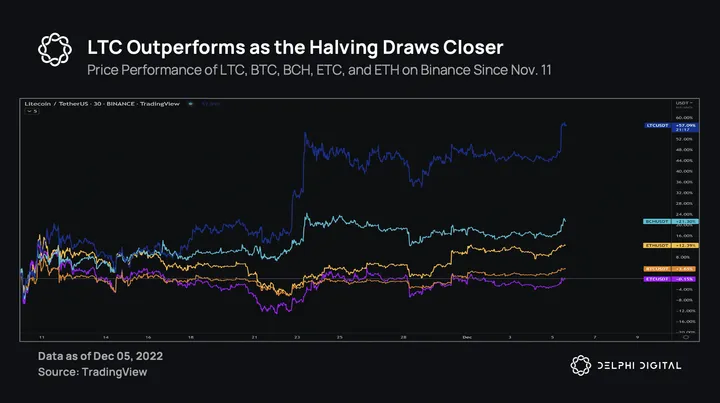 - Since FTX filed for bankruptcy, LTC has outperformed the market by gaining 57% as opposed to ETH up 12%, and BTC up 3%.