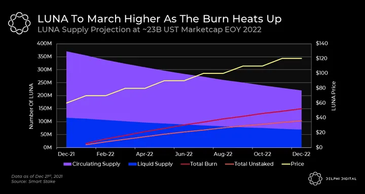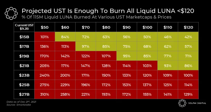 If UST can grow 150% in 2022 this will create over 13.8B UST, enough to burn roughly a third of LUNA’s circulating supply (>100% of the liquid supply) at $120 LUNA.