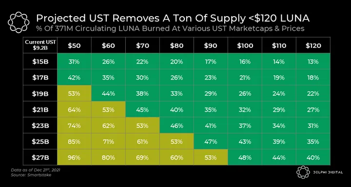 After accounting for all coins, LUNA’s current “liquid supply” sits at ~$9.2B — significantly less than the projected $13.8B growth in UST’s market cap. Using a matrix of UST market cap and LUNA’s price, we can illustrate various supply expansion scenarios for UST.