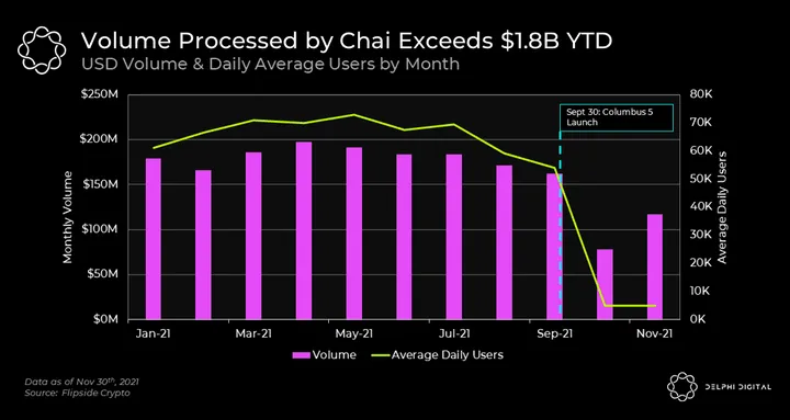 The first real world use case for Terra was Chai, a mobile payments app in South Korea. Chai uses Terra’s network and stablecoins to settle fiat payments with merchants at a fraction of the cost they would otherwise incur via traditional financial institutions. Since the inception of the partnership in 2019 until now, Chai’s user base has grown to approximately 40-50K daily active users. From the beginning of 2021 to the end of November, Chai has processed over $1.8B in payments, with over 70M individual transactions.