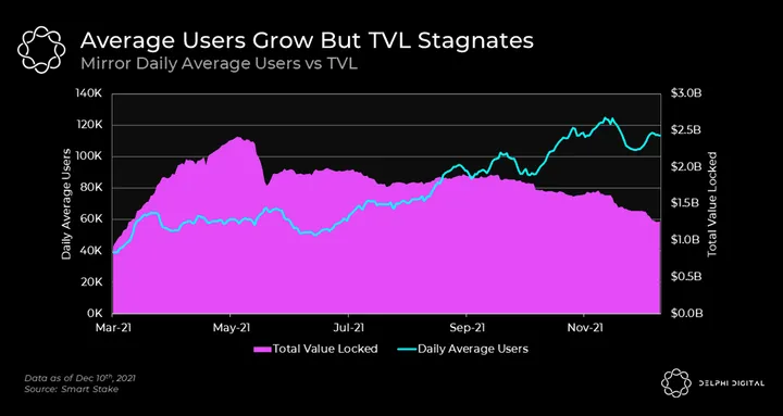 Since the most popular mAssets are a function of equities demand, this provides Terra with a less volatile, uncorrelated source of capital inflows and activity. In terms of protocol growth, Mirror’s TVL has been on the decline since mid-2021, but the number of daily users is on an upward trend. Which implies increased participation from users with small trade sizes and a decrease in whales.