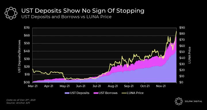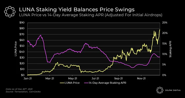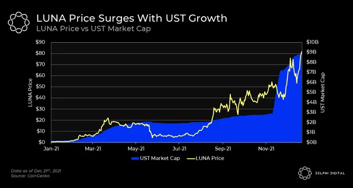 We’ve established that more UST volume and minting creates more value via fees for LUNA stakers. With UST’s tremendous growth in 2021, this has naturally resulted in more demand for LUNA.