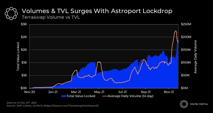 Note: DeFi Llama double counts some amount of TVL for base layer protocols. For instance, Lido and Anchor on Terra have partially overlapping TVL. We excluded Astroport from the above graphic for this reason, as it overlaps with Terraswap.