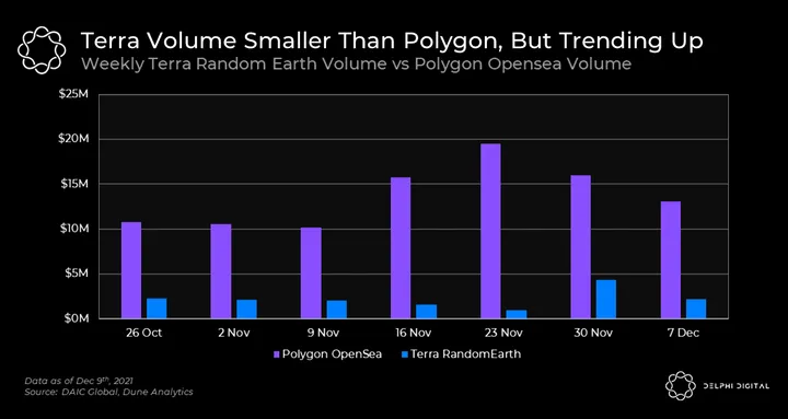 Terra’s NFT ecosystem has been evolving with the launch of its first NFT marketplace, Random Earth. At the time of writing, there are 51 active NFT collections listed, with an average of ~$300K in daily trading volume (16% of volume on Polygon’s Opensea) and ~2K daily users (25% of users on Polygon’s Opensea).
