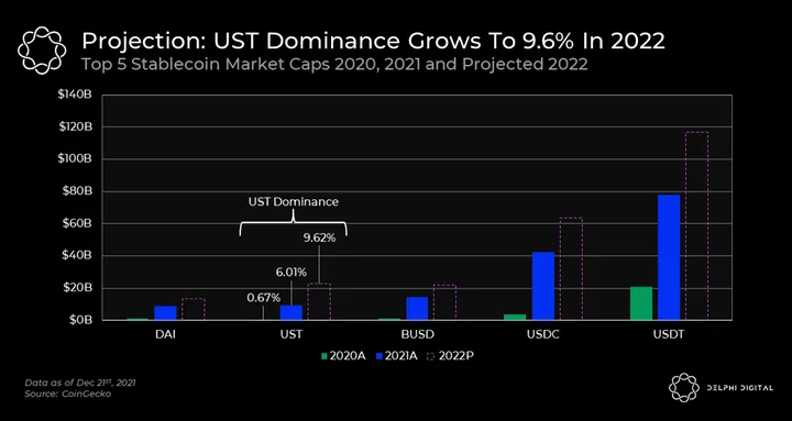 If we want to craft potential growth scenarios for UST, we can look at the top five stablecoins and how they’ve grown over the past two years. On aggregate, these stablecoins increased their market cap 5.6x from ~$27B at the end of 2020 to ~$153B today. Projecting out into 2022, if we believe there will be tightening regulation on stablecoins, we could see UST grow its market share further.