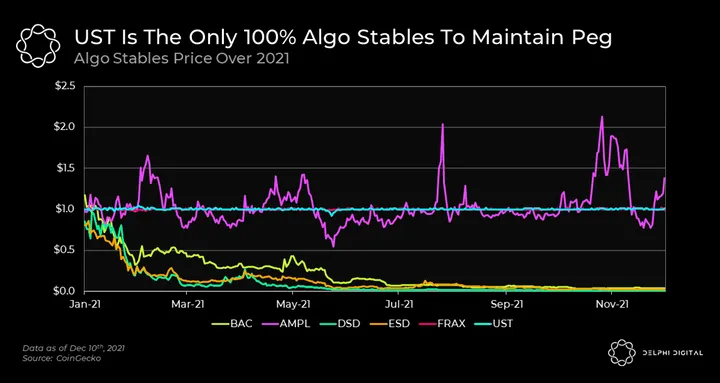 Many projects in crypto have tried to build algorithmic stablecoins (often called algo-stablecoins), and almost all of them have failed to maintain their peg. Below are a few examples from 2021.