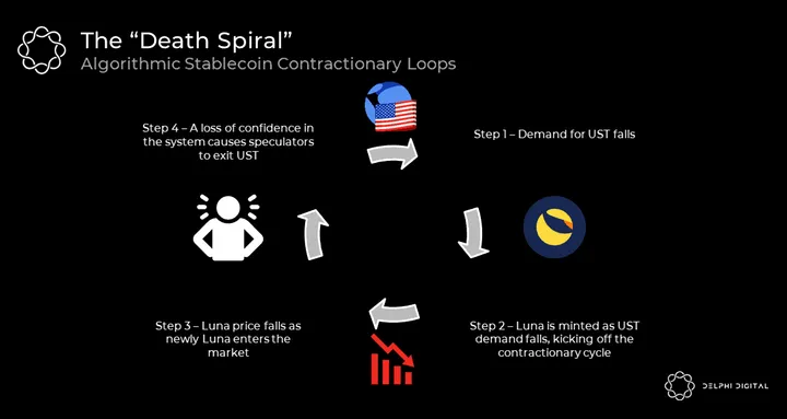 Without delving into the specifics of how these algo-stablecoins function, the bottom line is that users held them purely speculatively. There was no long-term incentive for users to hold these algo-stablecoins — an incentive that would compensate them for the risk of low or zero collateralization. In times of volatility and uncertainty, this makes them vulnerable to a situation commonly known as “the death spiral”.