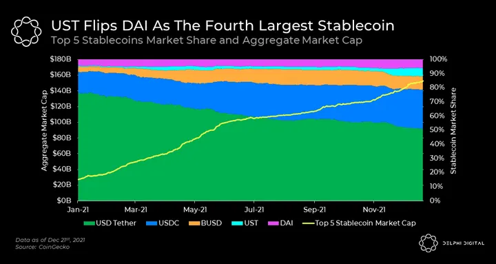 Terra’s native stablecoin, UST just flipped DAI as the fourth largest stablecoin with a $9.2B market cap. UST experienced extreme growth of ~50x in 2021 and is the only decentralized stablecoin among the top 5.
